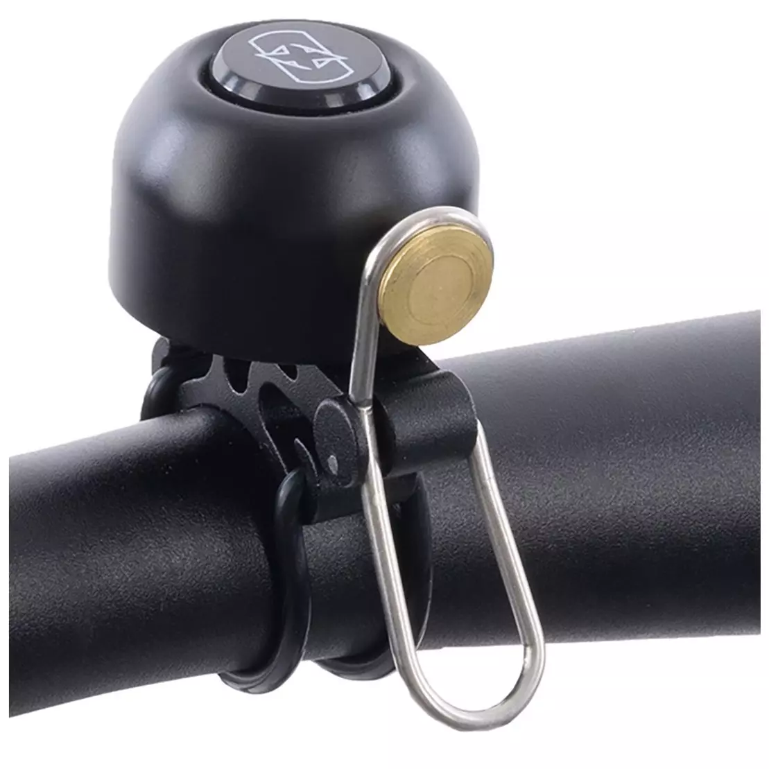 - czarny kompaktowy dzwonek rowerowy z obejmą o średnicy 22,2 mm, przeznaczony do kierownic o standardowym rozmiarze