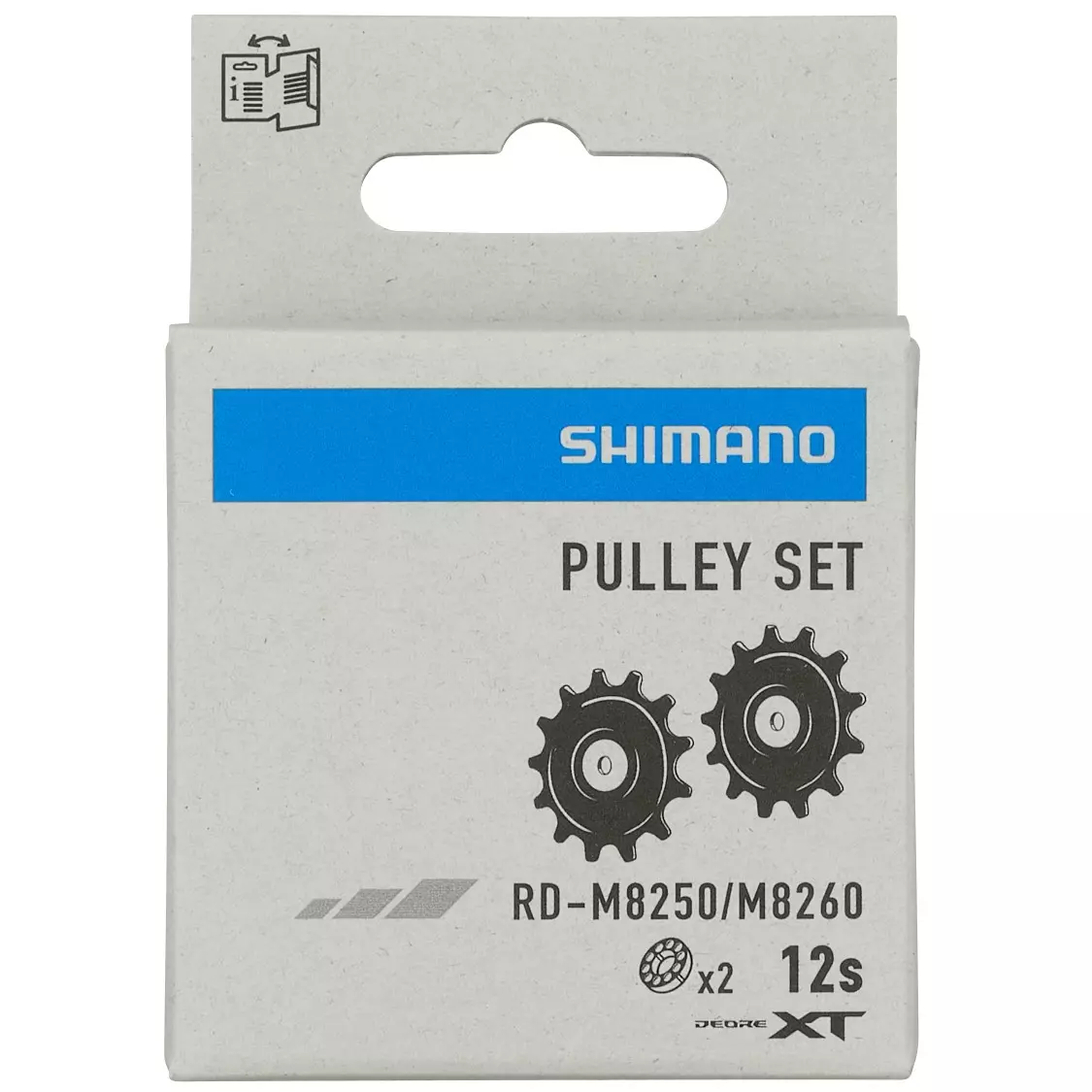 - Shimano RD‑M8250 Pulley Wheel Set to oryginalny zestaw kółek przerzutki zaprojektowany jako część zamienna do tylnej przerzutki Shimano 12-rzędowej serii Deore XT (RD-M8250)