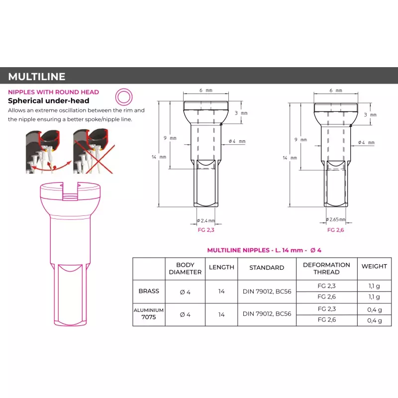 - spherical under-head - Umożliwia szeroki zakres oscylacji między obręczą a nyplem, zapewniając lepszą linię szprychy/nypla