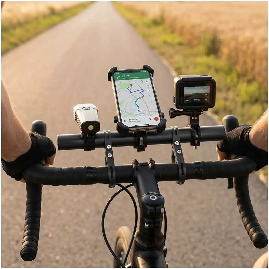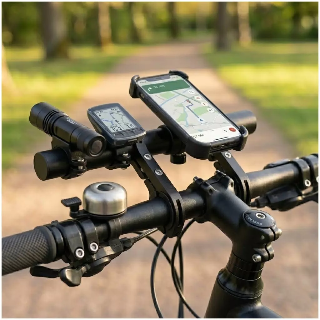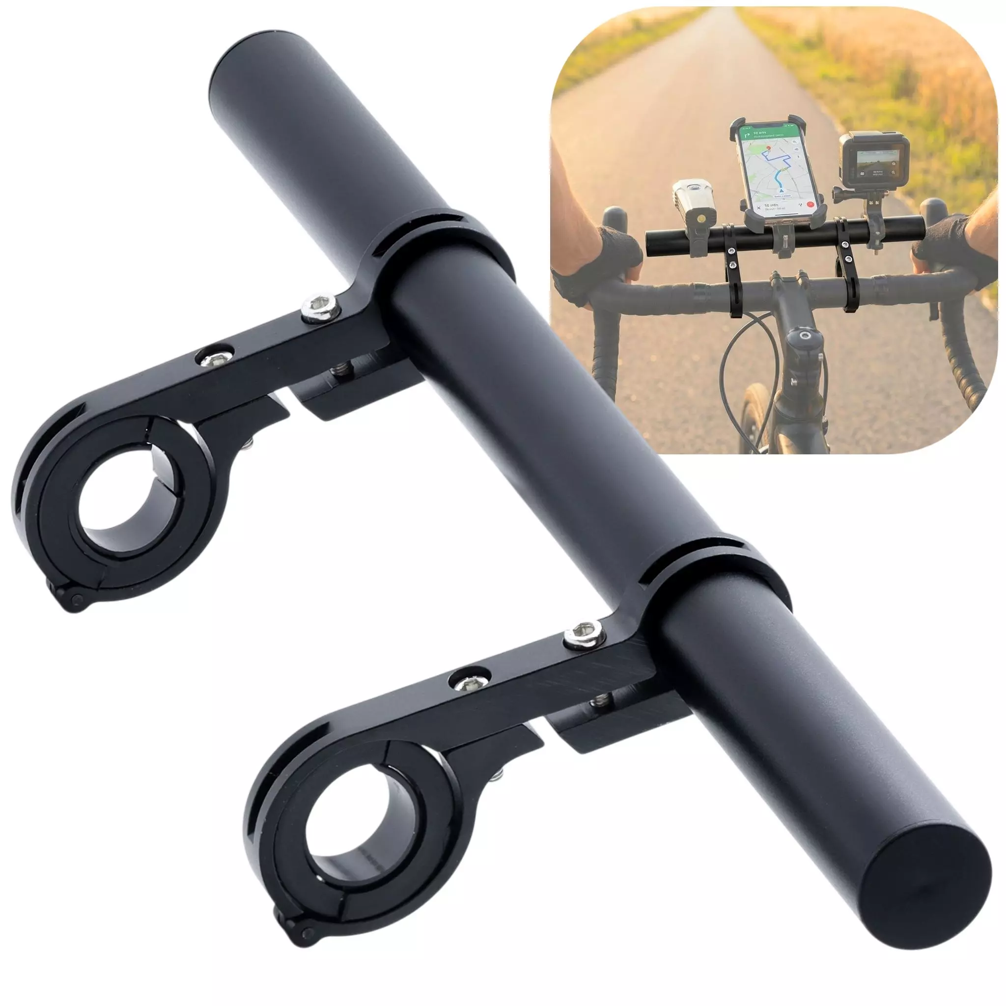 - Uchwyt rowerowy przedłużający kierownicę, który pozwala zamontować więcej akcesoriów: telefon, nawigację, dzwonek czy oświetlenie