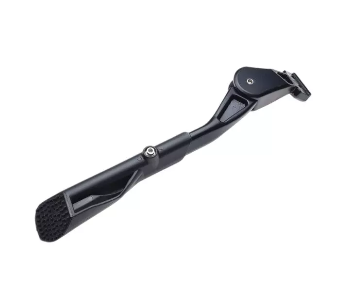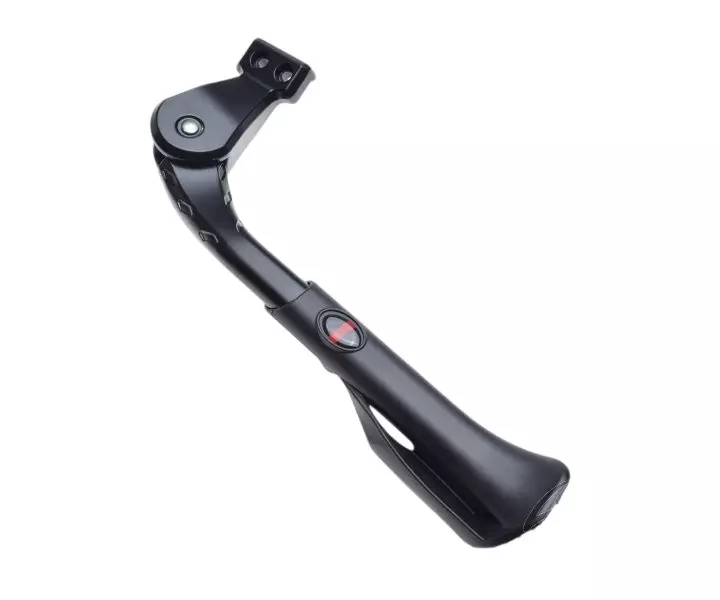 - Regulowana podpórka boczna do roweru, wykonana z lekkiego aluminium w kolorze czarnym