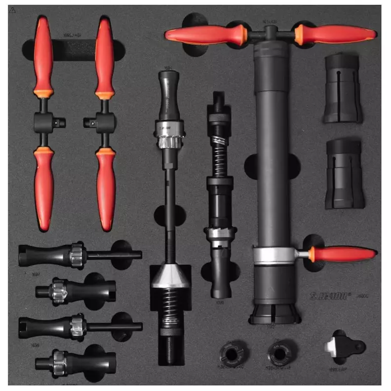 - Zawiera frezy, gwintowniki, prowadnice oraz uchwyty do precyzyjnej obróbki główek ram i muf suportu, a także ściągacz miski sterowej